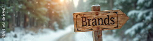 wooden signpost points brands snowy forest