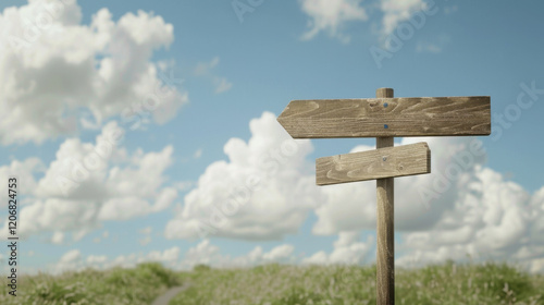 wooden signpost stands in grassy field under blue sky with fluffy clouds, symbolizing choices and direction