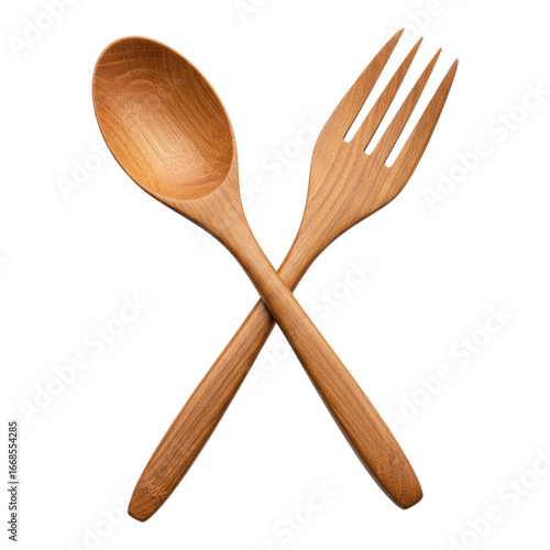 Wooden spoon and fork crossed isolated on transparent background