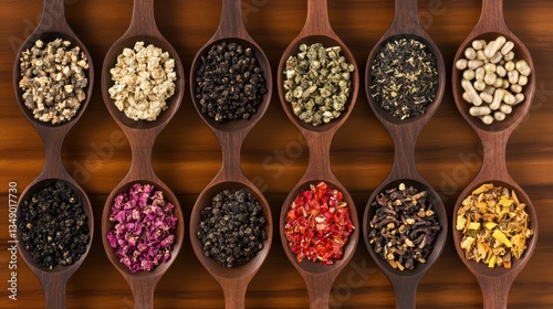 Wooden Spoons, Herbal Teas, Spices, Capsules, Wood Background, Variety, Assortment, Health, Wellness, Food Photography
