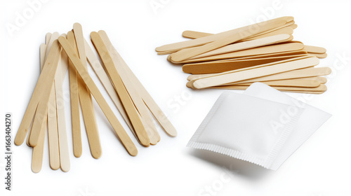 Wooden stirrers and sugar sachets set, (clean modern detail, white isolated background