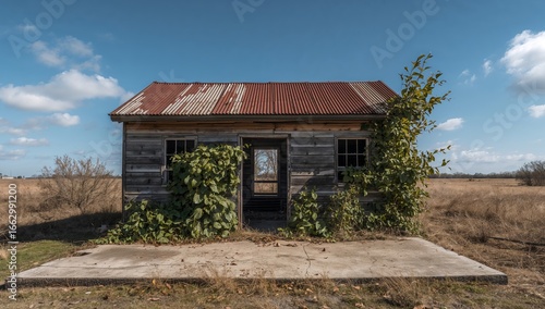 Wooden Structure on the Plains with Rusty Roof and Overgrown Vines, Clear Skies.
