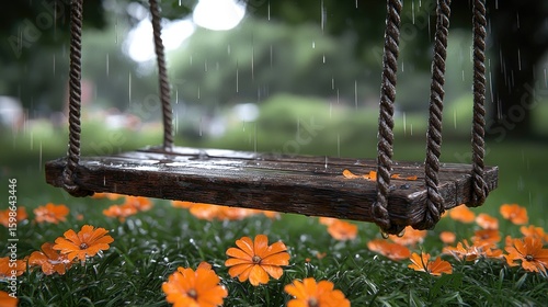 Wooden swing in rain, surrounded by flowers