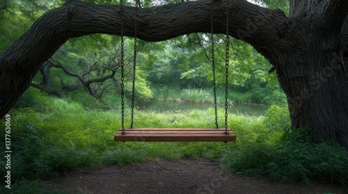 Wooden swing nestled beneath a large tree, overlooking a tranquil forest scene