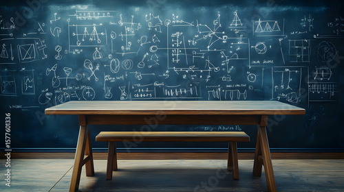 Wooden table and bench in front of a blackboard covered in mathematical equations.