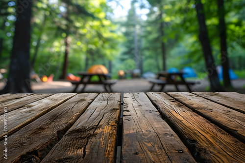 Wooden Table Foreground, Blurred Camping Setting Background, Campsite Adventure