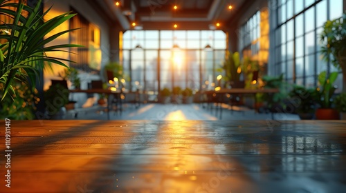 Wooden table in a modern office space with a sunset view