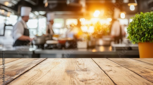 Wooden table in a vibrant restaurant kitchen with chefs working in the background.