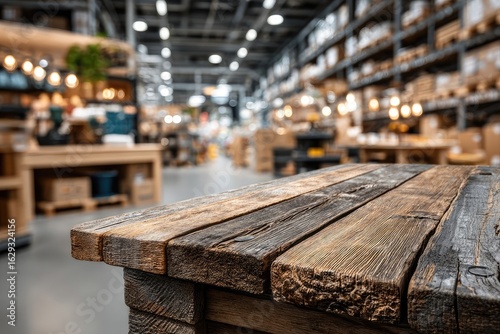 Wooden table top in front of a large warehouse
