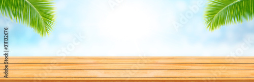 Wooden table with beautiful blurred blue sky with bokeh sunlight in background.