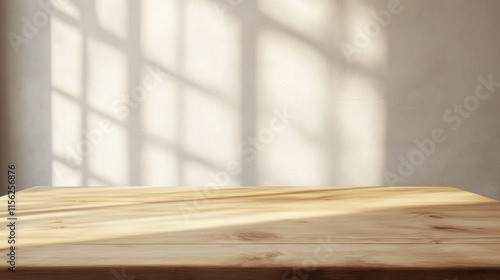 wooden table with soft shadows cast on light wall, creating serene atmosphere. natural light enhances texture of wood, inviting creativity and calmness