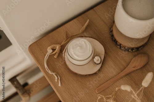Wooden Tabletop Cream Jar Dried Flowers Wooden Spoon