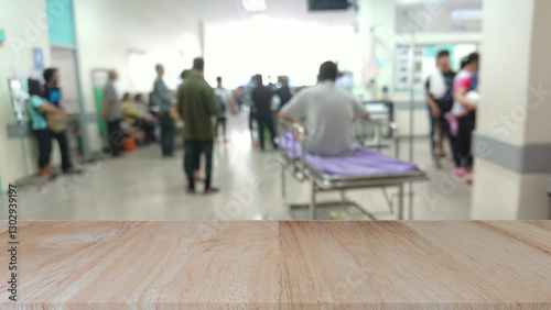 Wooden tabletop on blurred OPD background, can be used for display or montage your products.