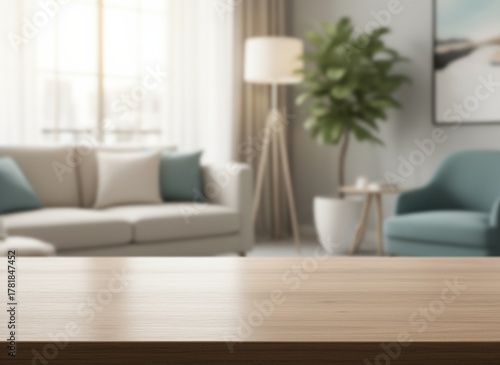 Wooden Tabletop with Blurred Living Room Background: Ideal for Product Display and Interior Design Mockups