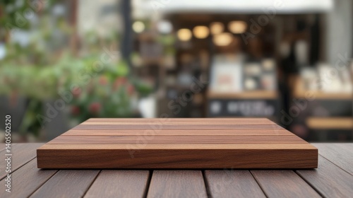 Wooden tabletop with empty space for product display in front of blurred modern coffee shop interior with warm lighting and retail shopping ambiance