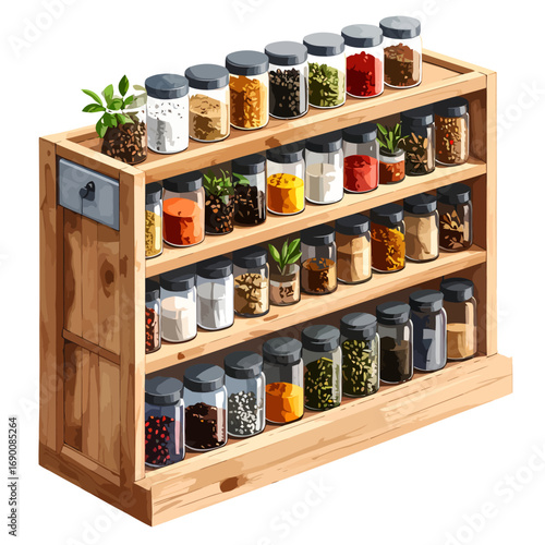 Wooden three tier spice rack organizer with assorted spices in glass jars.