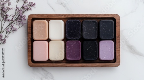 Wooden tray with nine rectangular soaps arranged in a grid-like pattern. the soaps are of different colors - pink, white, black, purple, and light pink.