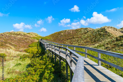 Wooden walkway to beach among sand dunes on Sylt island, Germany