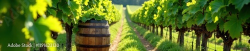 Wooden wine barrel surrounded by lush green vines and grapevines in a picturesque vineyard setting, vineyard, vines