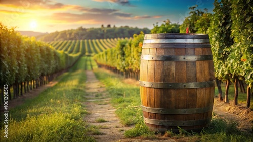 Wooden wine barrel with a rustic charm, standing alone in a vineyard, vineyard, wooden barrels, rustic wine barrel, wine cellar