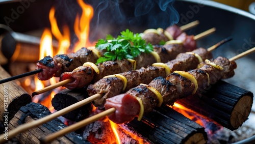 Wood-Fired Kebab Skewers Grilling Over Open Flames With Fresh Herbs and Vegetables