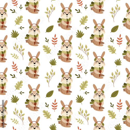 Woodland seamless pattern with cute rabbit and fall leaves. Hand drawn vector autumn illustration.