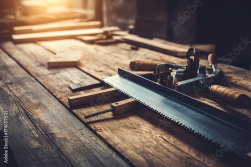 Woodworking tools, including a saw and chisel, are arranged on a rustic wooden workbench in warm natural light