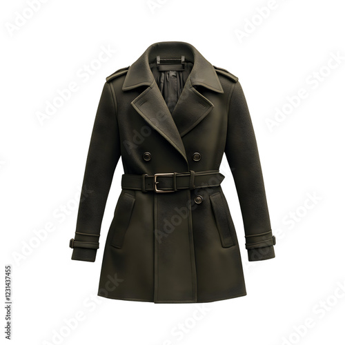 Wool Trench Coat in Olive Green with Belt Isolated on Transparent Background
