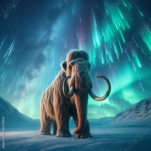 Woolly Mammoth under Aurora Borealis in Arctic Landscape