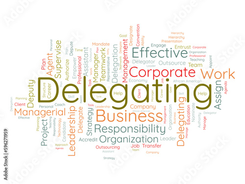 Word cloud background concept for Delegating. Business responsibility, career management assign of strategic leadership approach. vector illustration.