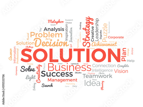 Word cloud background concept for Solution. Planning strategy, creativity solution and development, inspiration leadership, Innovative of new ideas. vector illustration.