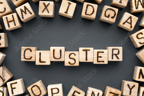 word cluster composed of wooden cubes with letters, a group of businesses or computers that work together concept, scattered around the cubes random letters, top view on gray background