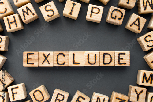 word exclude composed of wooden cubes with letters, not include something concept, scattered around the cubes random letters, top view on gray background