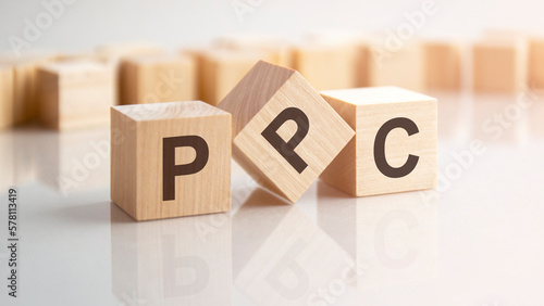 word PPC made with wood building blocks, stock image. background may have blur effect
