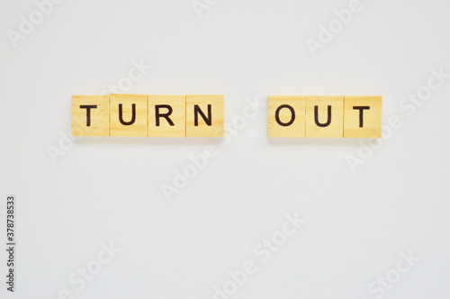Word turn out. Wooden blocks with lettering on top of white background. Top view of wooden blocks with letters on white surface