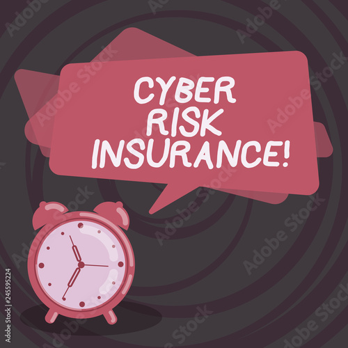 Word writing text Cyber Risk Insurance. Business concept for covers financial losses that result from data breaches Blank Rectangular Color Speech Bubble Overlay and Analog Alarm Clock