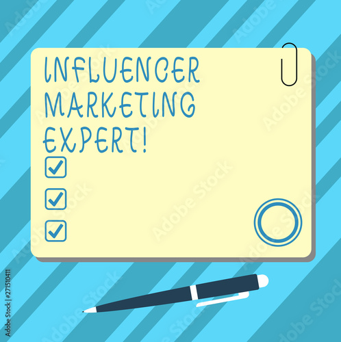 Word writing text Influencer Marketing Expert. Business concept for Skilled in driving brand message and awareness Blank Square Color Board with Magnet Click Ballpoint Pen Pushpin and Clip