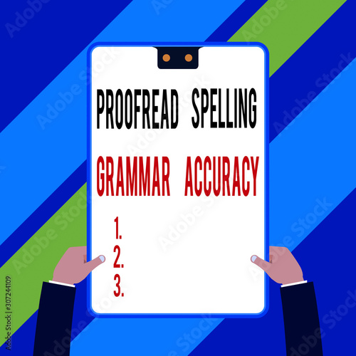 Word writing text Proofread Spelling Grammar Accuracy. Business photo showcasing Grammatically correct Avoid mistakes Two executive male hands holding electronic device geometrical background