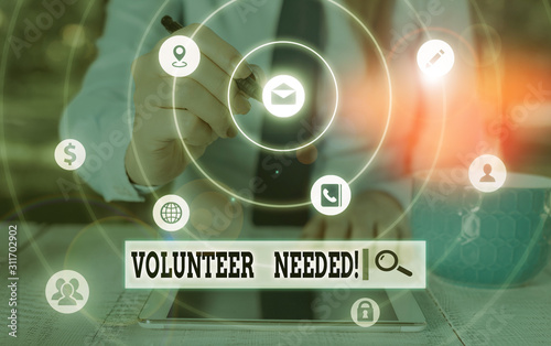 Word writing text Volunteer Needed. Business photo showcasing asking demonstrating to work for organization without being paid