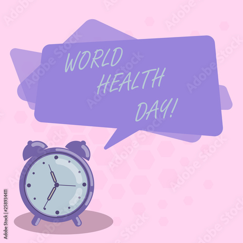 Word writing text World Health Day. Business photo showcasing Global health awareness day celebrated every year Blank Rectangular Color Speech Bubble Overlay and Analog Alarm Clock