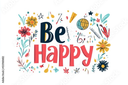 words "Be Happy" in colorful lettering, retro-style elements like flowers ,stars, globes