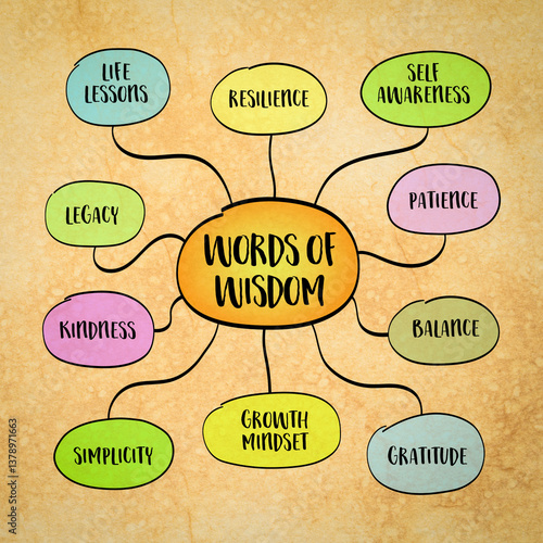 Words of wisdom, distilled knowledge, life lessons, and deep insights gained through experience, reflection, and learning. Infographics sketch.