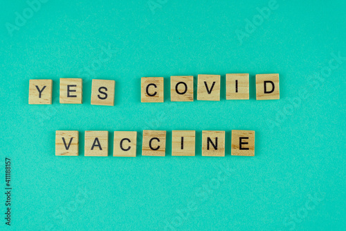 Words YES Covid Vaccine. The phrase is laid out in wooden letters. Top view. Motivation. Copy space.