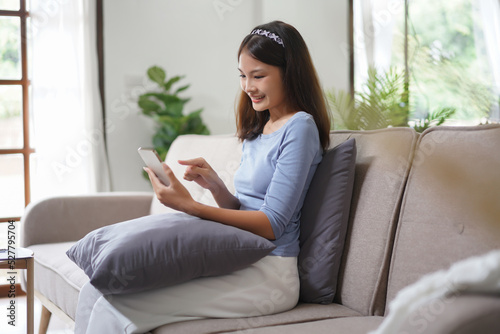 Work from home concept, Business women check monthly income on phone while working remotely at home
