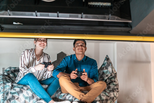 Work hard play hard. Workers Playing computer games man against woman during break in relaxation area at creative startup Office