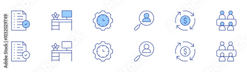 Work icon set in two styles, Duotone and Thin Line style. Editable stroke. result, work space, time management, recruitment, circular economy, meeting