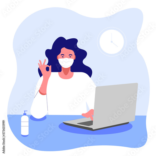 Work in a mask at a computer. Office work, distant work, coronavirus. Masked girl with a laptop showing that everything is fine - color vector illustration in a flat style