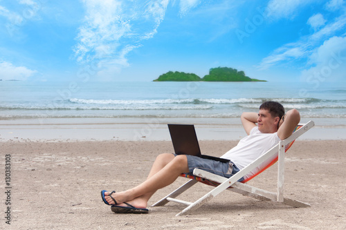 Work of dream in open air. Freelancer man sitting in deck chair on sea beach. Freelance and remote work