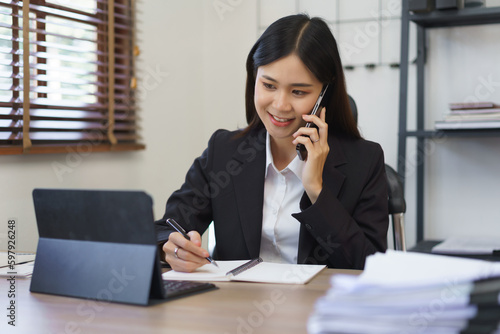 Work of secretary concept, Female secretary talks on phone with boss and taking notes in notebook