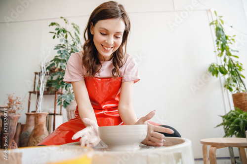 Work potter wheel. Happy young woman in red apron sculpts from clay